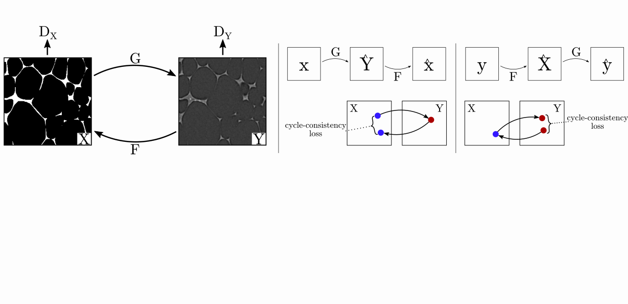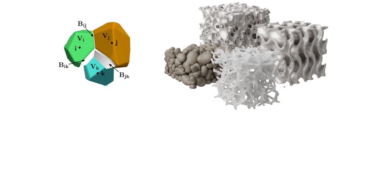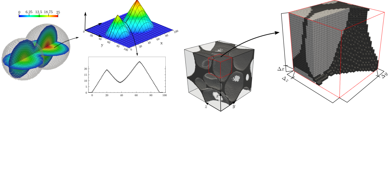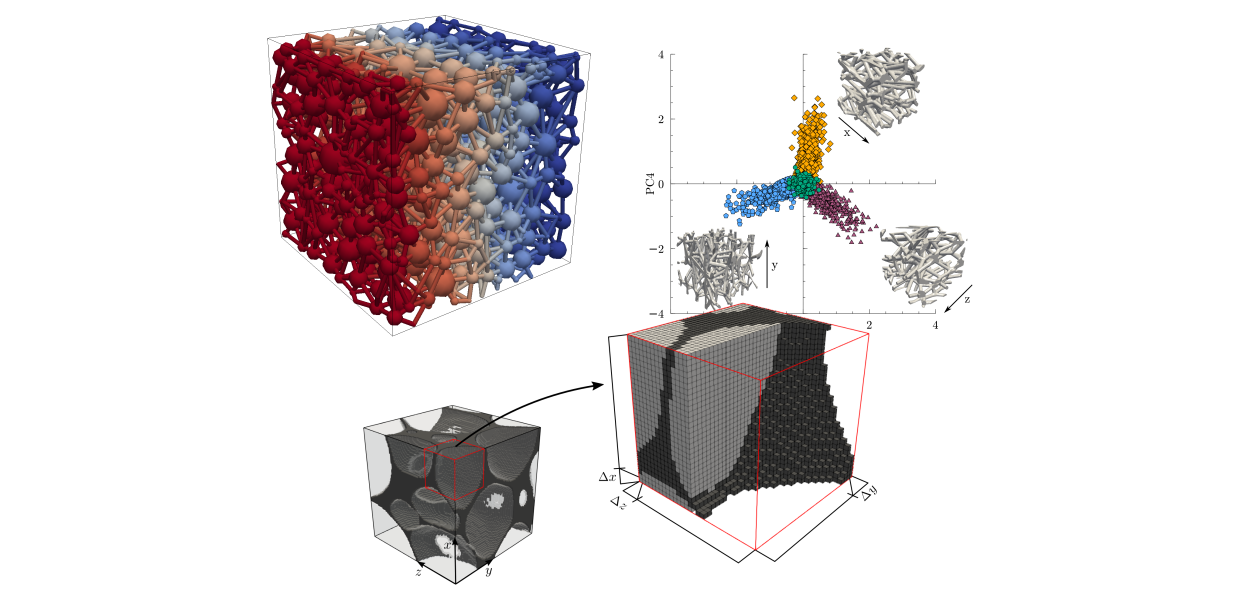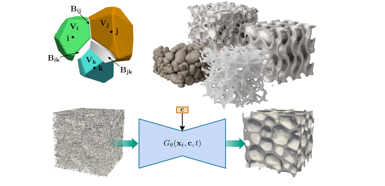 The research group “Microstructure – Data Science” focuses on the data-driven analysis and optimization of microstructures. To this end, methods for segmentation, characterization, and structure synthesis are developed, alongside data-driven analysis tools that make the interplay between microstructural features and macroscopic material behavior observable. In addition, computer vision techniques are specifically applied to medical imaging data. The developed methods are designed such that they can be transferred across domains and address both materials science and medical applications. For the creation of digital twins of microstructures, large-scale phase-field simulations are combined with computer vision methods that segment image data from various imaging modalities and reconstruct them into high-resolution 3D models. Building on these representations, generative algorithms and generative AI models are employed to synthesize microstructures with controllable properties, enabling realistic representations of porous systems such as membranes, grain structures, and geological packings. In collaboration with the “Research Data Management” group, workflows are developed for the reproducible and FAIR-compliant analysis of large datasets, ensuring that the described methods are automated, standardized, and reusable across different application contexts. The overarching aim of the research activities is the bridging of length scales through the identification of effective structure–property relationships and the development of data-driven predictive models that support accelerated and informed materials design.